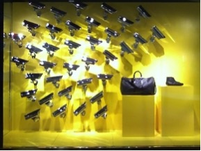 A priori, rien ne laisse présager des possibles relations entre l’univers de la séduction et celui de la vidéosurveillance. En 2008, les vitrines internationales des magasins Louis Vuitton ont pourtant intégré une politique de design intégrant des éléments caractéristiques de ces dispositifs de contrôleVoir la vitrine des magasins Louis Vuitton : vêtements (2008).↩︎. Il était alors possible d’admirer une multitude de caméras de surveillance braquées sur le modèle exposé. Le consommateur-voyeur observant les caméras était ainsi engagé dans un jeu de regard désignant en abyme ce qu’il était censé acheter, la vitrine exposant la démarche de séduction de la marque tout en soulignant la valeur de l’objet mis sous haute surveillanceVoir la vitrine des magasins Louis Vuitton : accessoires (2008).↩︎.
