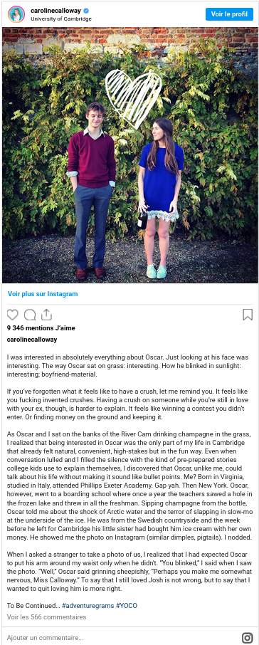 Caroline Calloway est une Américaine d’une vingtaine d’années qui publie le récit de ses aventures sur les réseaux sociaux depuis juin 2012. Son lectorat a dépassé petit à petit le cercle de ses relations pour atteindre aujourd’hui plus de 608 000 abonnés sur InstagramConsulter le compte Instagram de Caroline Calloway.↩︎ – son réseau de prédilection, 53 600 sur TwitterAccéder au compte Twitter de Caroline Calloway.↩︎ et 50 700 sur FacebookConsulter la page Facebook de Caroline Calloway.↩︎Chiffres en date d’octobre 2016.↩︎. Cette étudiante en histoire de l’art relate son expérience en Angleterre à l’Université de Cambridge. Il s’agit pour elle de raconter « l’histoire de sa vie », celle d’une jeune Américaine face aux déboires universitaires, aux rencontres amicales festives et aux tumultes amoureux propres à ce moment de bascule vers l’âge adulte. Sous le hashtag « #adventuregrams », Calloway documente donc sa vie. Son approche médiatique est hybride : chacun de ses messages sur Instagram est constitué d’une image et d’un texte qui, s’il reste court, atteint tout de même souvent la limite de caractères imposée par le site. Photographies d’elle-même, de ses amis, paysages des lieux qu’elle a visités, de ses repas : ses images comme ses textes dépeignent une vie qui semble avant tout tenir du conte de fées. À ce titre, son petit ami Oscar, jeune et séduisant étudiant suédois, fait indubitablement figure de prince charmant…
