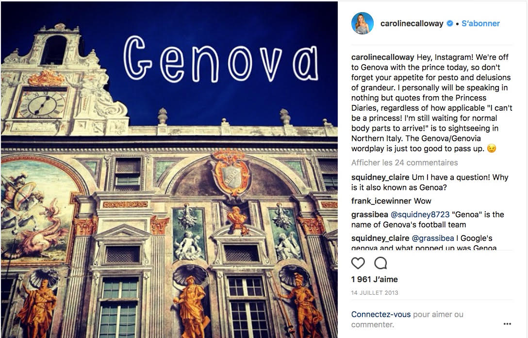 Chaque image est soigneusement choisie et traitée par la jeune femme qui les recadre et utilise des filtres afin d’esthétiser au maximum ses prises de vue. Celles-ci sont toujours en lien direct avec le texte qui les accompagne, illustrant le lieu où le récit se déroule ou l’un de ses protagonistes. Ainsi, Calloway agrémente le récit de son voyage au Danemark par une photographie de Copenhague flanquée d’un titre précisant le nom de la ville dans une typographie stylisée, un effet que l’on retrouve sur chaque illustration de ses voyages (New YorkVoir l’image publiée par Caroline Calloway sur Instagram illustrant son voyage à New York. Ce post n’est plus disponible sur Instagram.↩︎, GênesVoir l’image publiée par Caroline Calloway sur Instagram illustrant son voyage à Gênes. Ce post n’est plus disponible sur Instagram.↩︎, etc.). Cette attention à la typographie, ainsi que le désir de construction d’une continuité, soulignent le caractère construit du récit de Caroline Calloway.