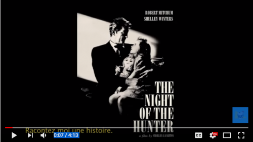 C’est pourtant l’affiche en noir et blanc du film The Night of the HunterThe night of the hunter (La nuit du chasseur), réalisé par Charles Laughton, avec Robert Mitchum (1955). Adaptation du roman de Davis Grubb (1953).↩︎ qui apparaît d’abord puisqu’une conversation entre un homme et une enfant sert de cadre aux épisodes.